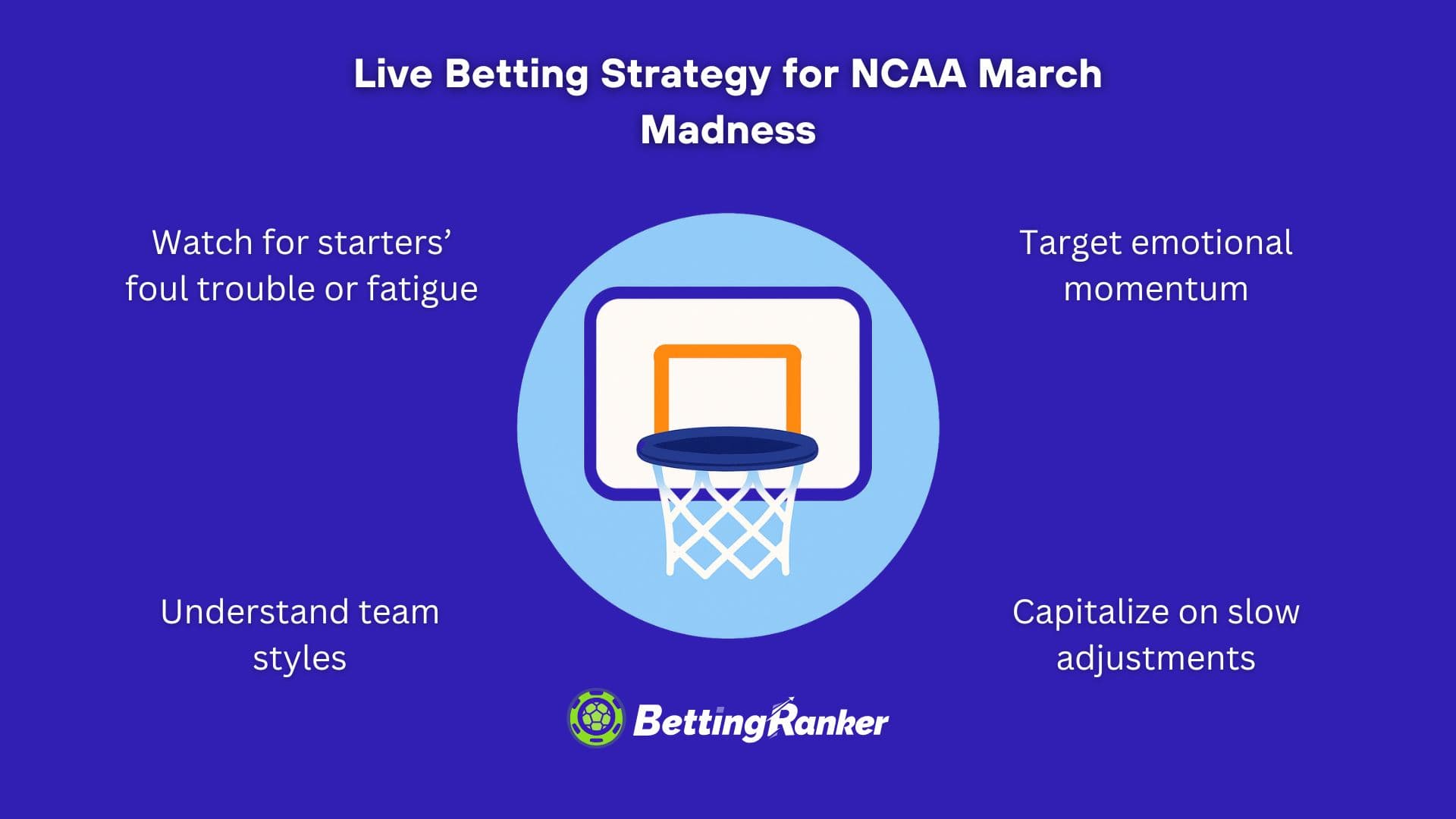 Las apuestas en vivo durante el March Madness de la NCAA son una de las formas más emocionantes y estratégicas de participar en el torneo. Con cambios de impulso, intensidad emocional y partidos consecutivos, los mercados en juego abren oportunidades que las líneas previas al partido no pueden. Para tener éxito en las apuestas en vivo, ten en cuenta estas estrategias clave: